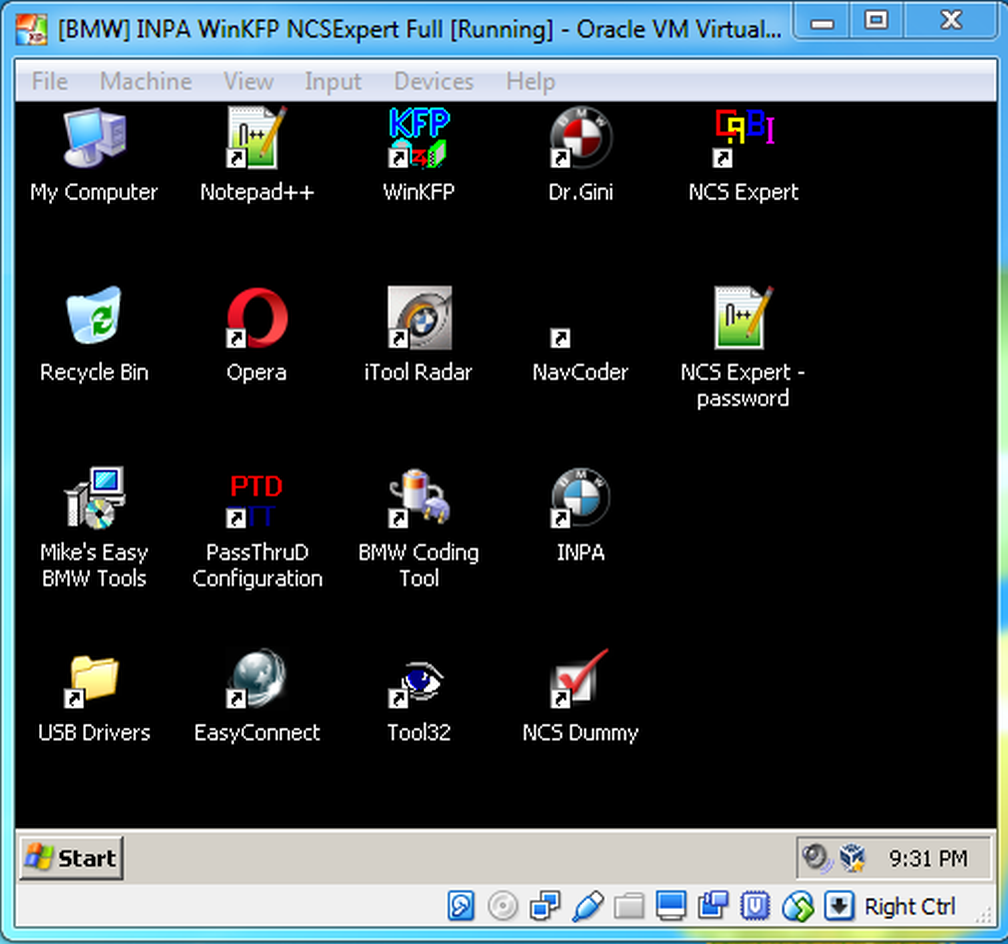All the software and tools you might need for coding and flashing a BMW, are pre installed and configured in a Virtualbox image. Works with a K+Dcan cable – INPA, NCS Expert + NCS Dummy, WinKFP, EDIABAS, ToolSet 32, BMW Coding tool, NavCoder, BMW PassThru Tool + iToolRadar + EasyConnect for connecting with other cables (ICOM, Ethernet, etc.)